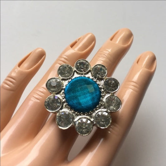 Brand-new big chunky adjustable statement ring 💍 fashion jewelry. 💎 This has a blue round gem stone design in the middle with rhinestones around it.