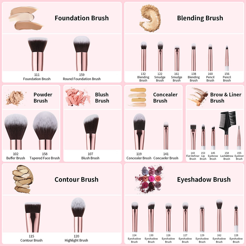 Used With: Powder Brush, Round Foundation Brush, Flat Foundation Brush, Contour Brush, Tapered Face Brush, Large Concealer Brush, Blush Brush, Highlight Brush, Shader Brush, Angled Eyeshadow Brush, Flat Definer Brush, Smudge Brush, Pointed Blending Brush, Small Blending Brush, Pencil Brush, Eyeliner Brush, Eye Shadows Brush, Eyebrow Brush, Lip Brush/pinceis de maquiagem