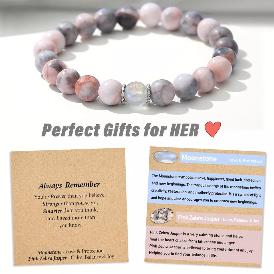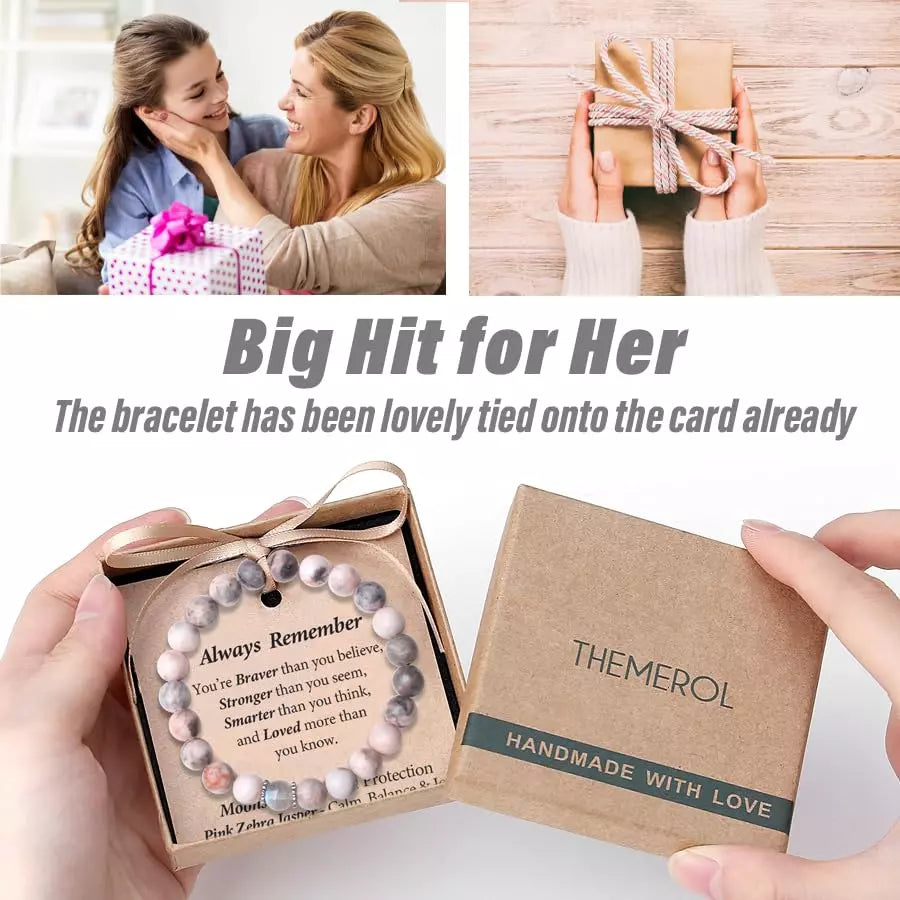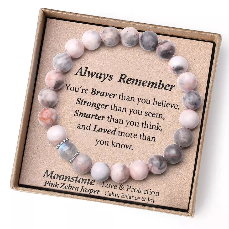 This handmade bracelet is lovely tied onto a backing card which features the text 'Always remember you are braver than you believe...' or 'Beautiful girl, you can do amazing things' and the meaning of the natural crystals. It's a cute yet inspirational gift for her.