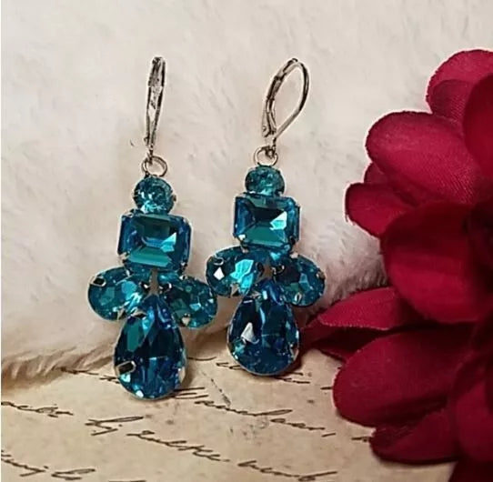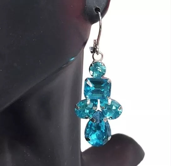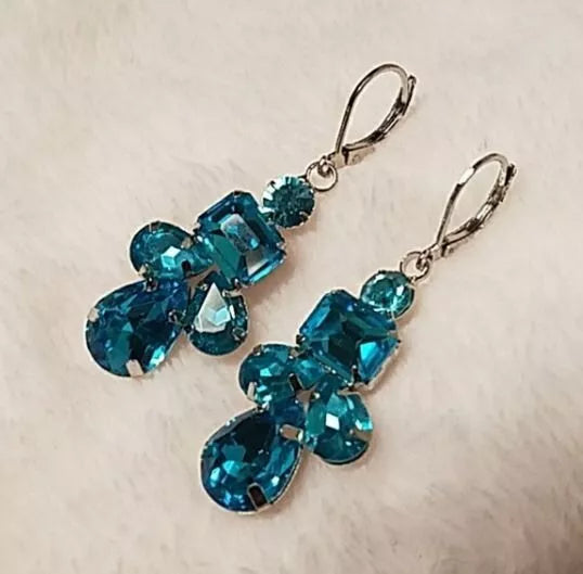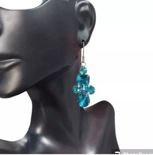 New E897 2" Blue Geo Shaped Crystal Drop Earrings. Women's Fashion Accessories.