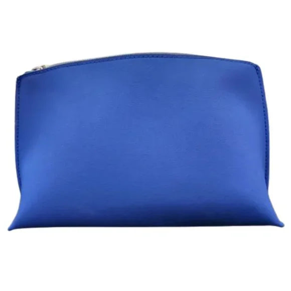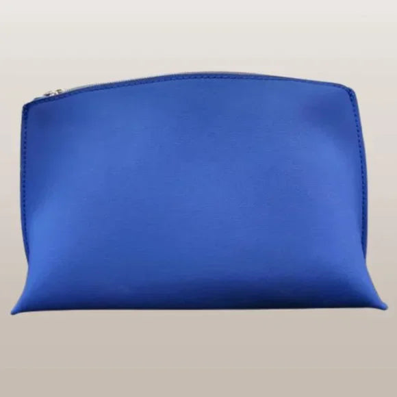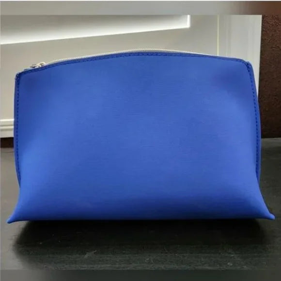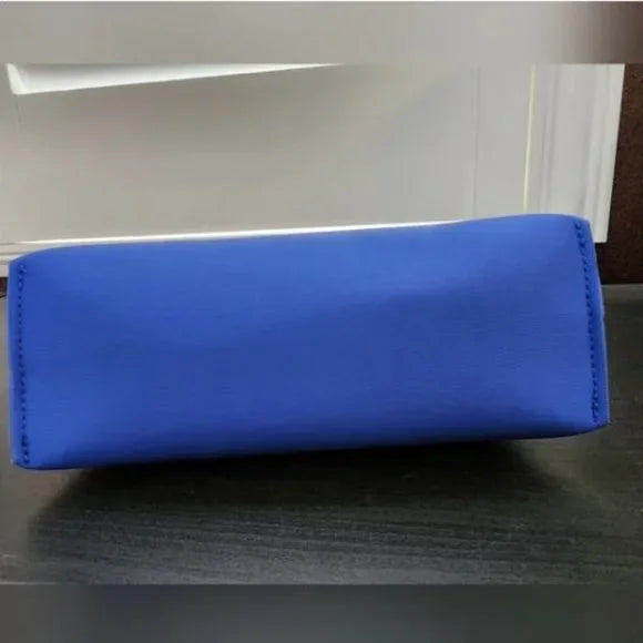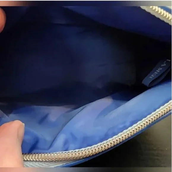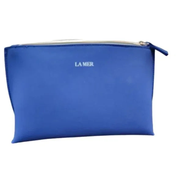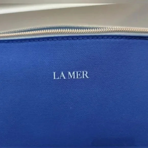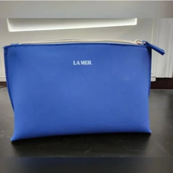 New La Mer Makeup Bag with top zipper closure Blue with matching blue interior 9" x 5" x 3"