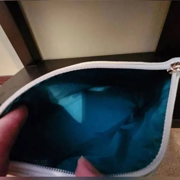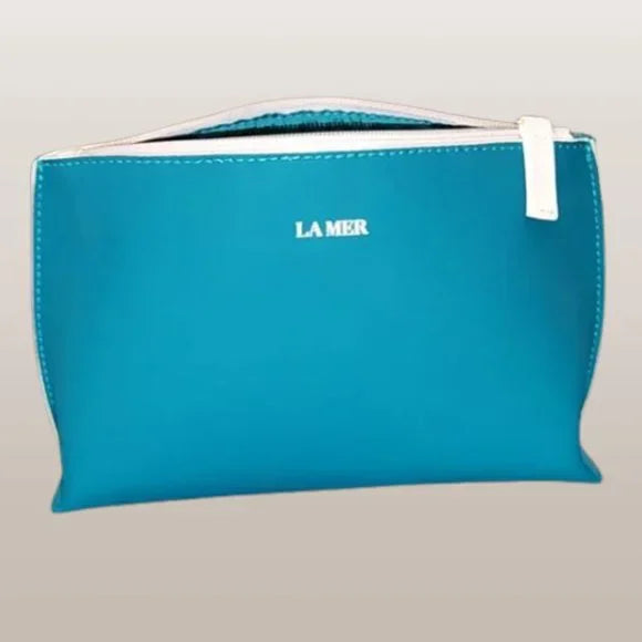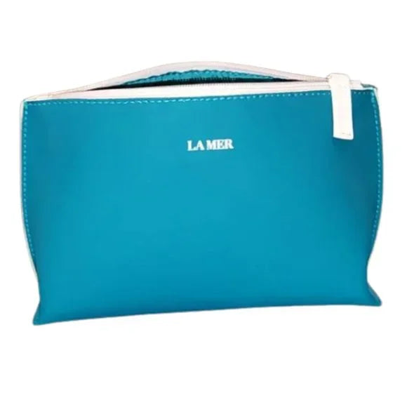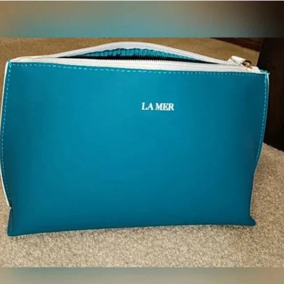 New La Mer Makeup Bag with top zipper closure dark green with white piping 8.5" x 5" x 3"
