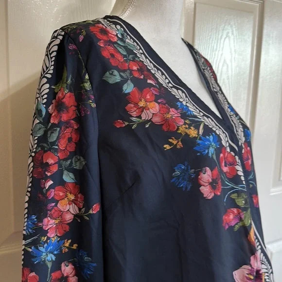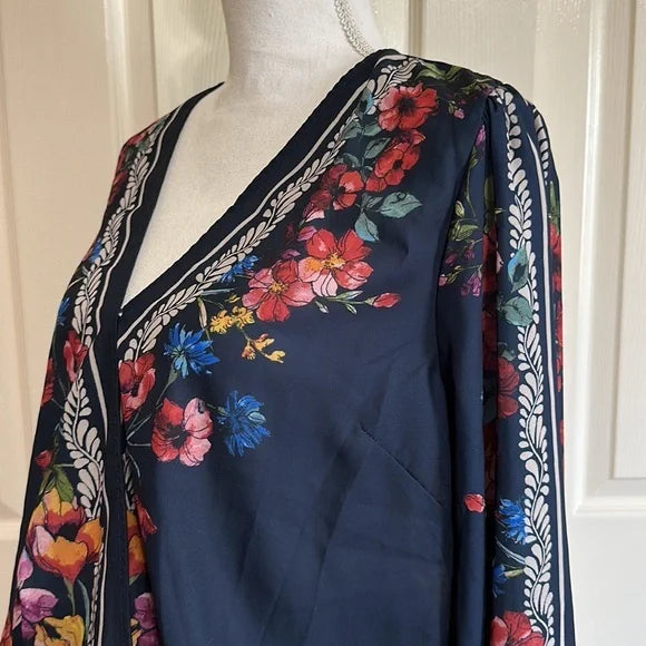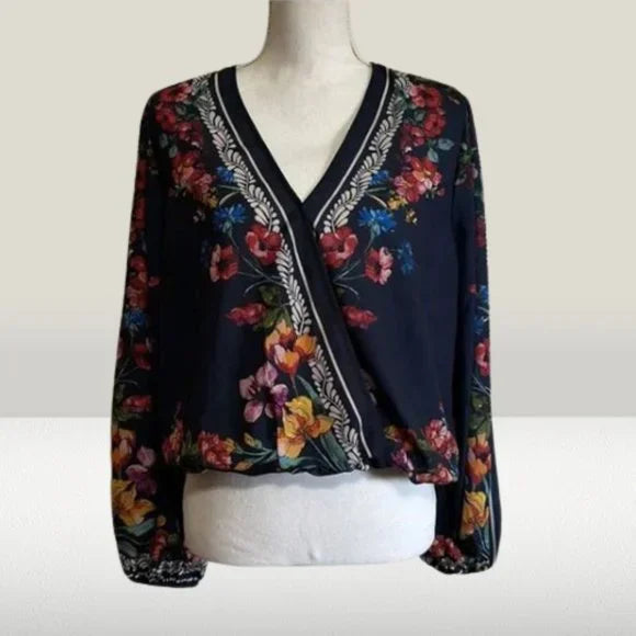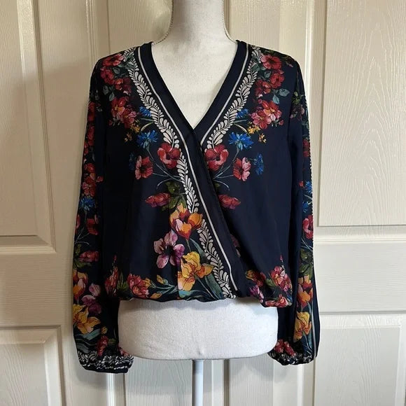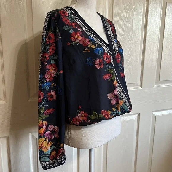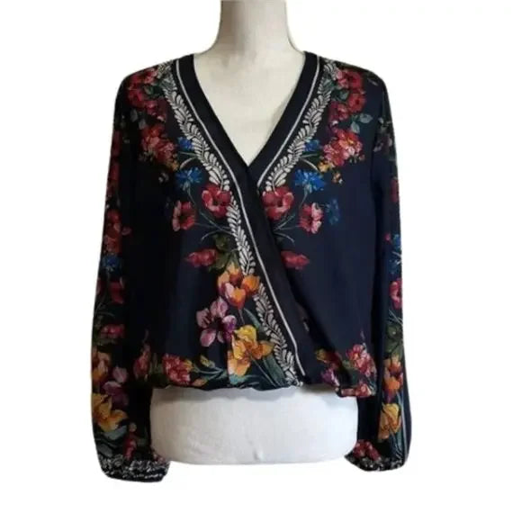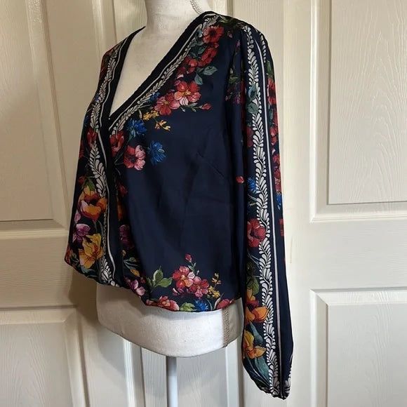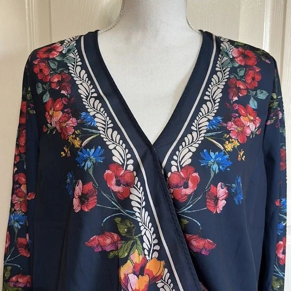 NWT Juniors Francesca's long sleeve blouse size XL with floral designs. Stretchable waistline
