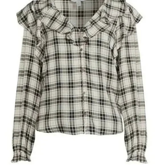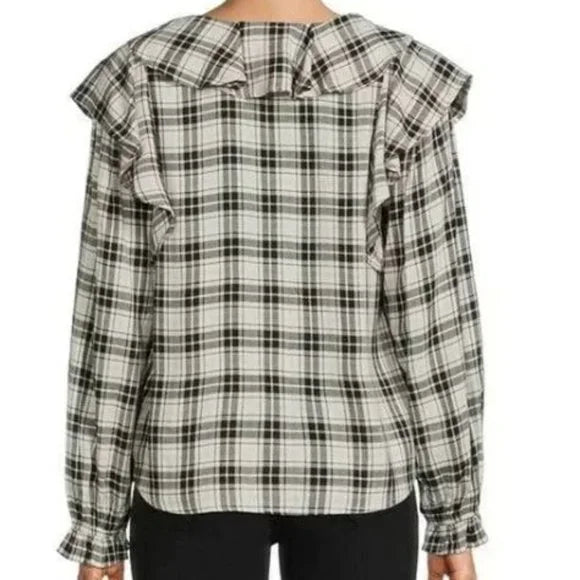 NWT Time and Tru Plaid Black & White Ruffle Long Sleeve Blouse Size XL