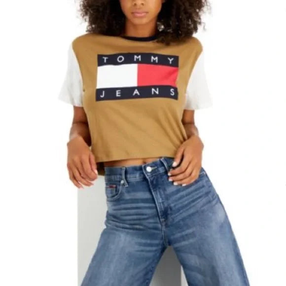NWT Tommy Hilfiger Logo Colorblock Blouse Top T Shirt size‎ XL Tan Brown