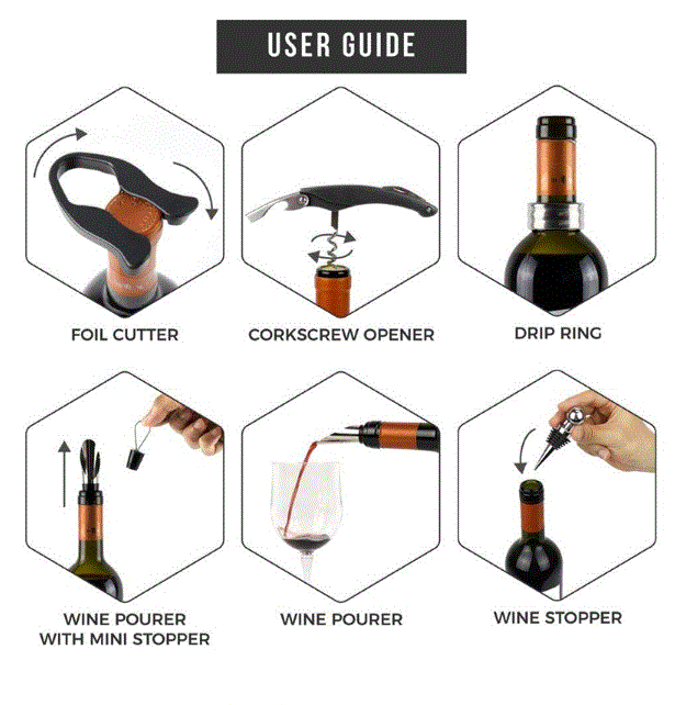 This set comes with a bottle opener, aluminum foil cutter, wine stopper, drip ring, and wine pourer - everything you need to fully enjoy your wine.