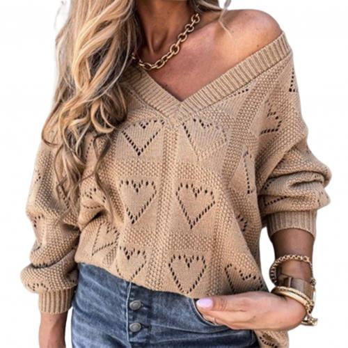 Casual Solid Color Sweater Women Jumper Pullover Tops: Fashion Lady Hollow Out Heart Shape V Neck Ribbed Knitted Sweaters