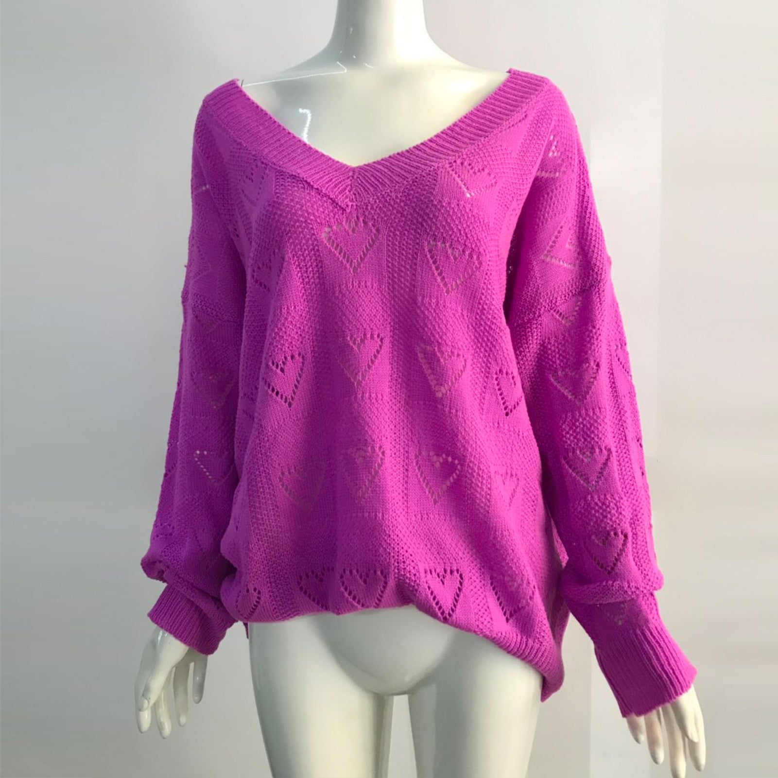 Fashion Women Solid Color Sweaters Heart Shaped Hollow Out Design: See-Through V-Neck Long Sleeve Casual Loose Pullovers Top